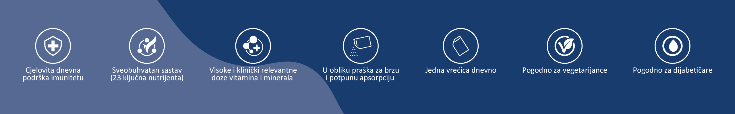 Sastojci: Minerali (magnezij citrat, kalcij fosfat, željezo bisglicinat, cink bisglicinat, L-selenometionin, mangan bisglicinat, bakar bisglicinat, hrom pikolinat, amonij molibdat, kalij jodid) vitamini (L-askorbinska kiselina, D-alfa tokoferil acetat, nikotinamid, tiamin hidrohlorid, riboflavin, piridoksin hidrohlorid, holekalciferol, menakinon, retinil acetat, kalcij D-pantotenat, folna kiselina, D-biotin, cijanokobalamin), maltodekstrin, regulator kiselosti: limunska kiselina, arome, bojilo: karoteni, sladilo: sukraloza.